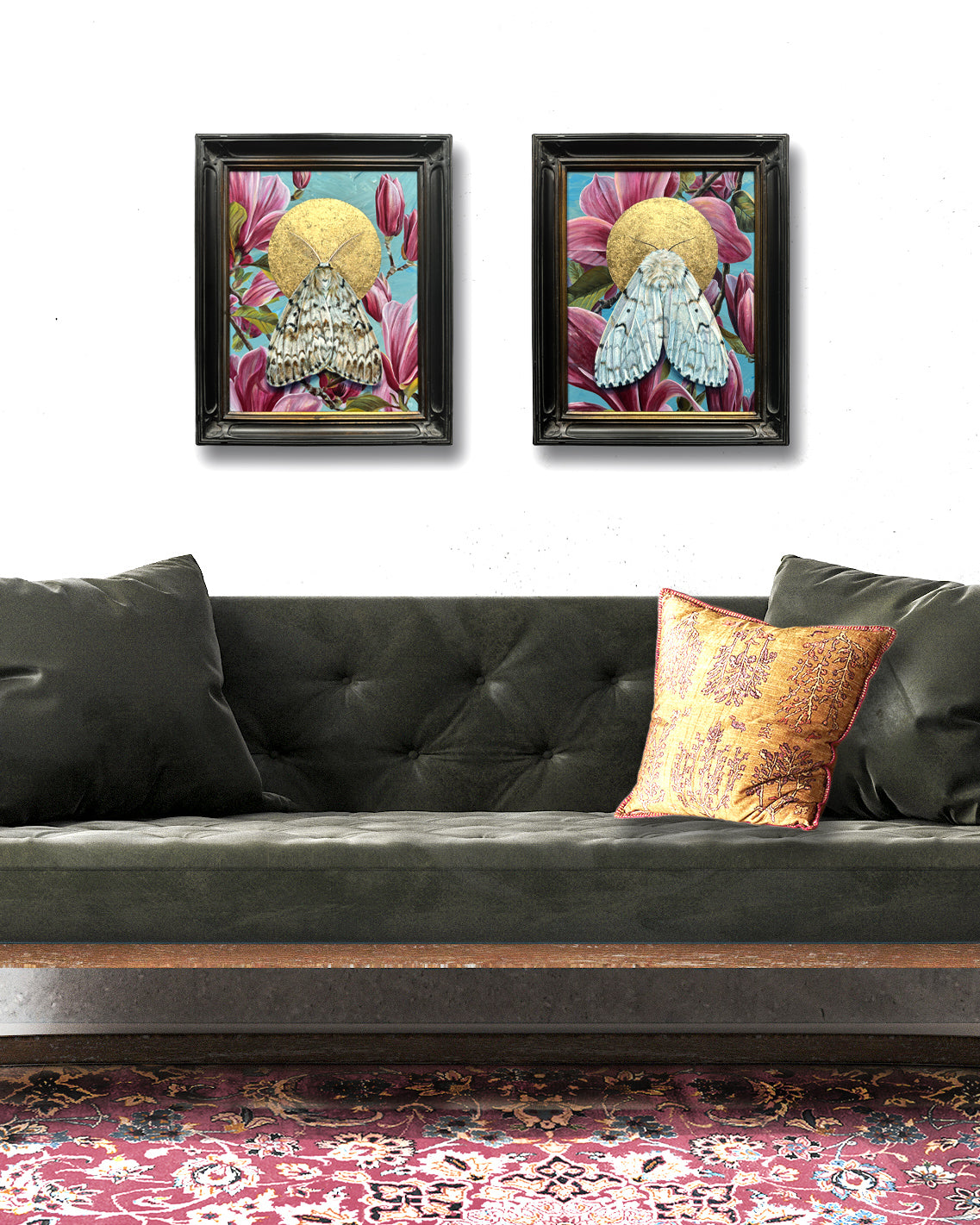 The Reverberation collection explores hope, balance, and our impact on future generations through moths and magnolias. Though magnolia blooms last only days to weeks, the trees can live for centuries, providing food, oxygen, and medicine to sustain life. Similarly, many moths emerge from the cocoon with no ability to eat and live just a few days—existing solely to reproduce and ensure the survival of what comes next. Both creatures speak of impermanence and cyclic beauty, of purpose and creation.