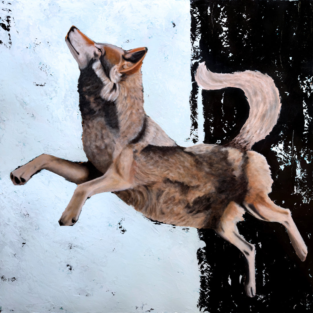 Bring some mystery into your space with this richly textured original wolf painting by Danny Gordo. "Ascent" features a majestic wolf leaping against an abstract ice blue and black backdrop. The layered tones and intriguing composition of this wolf artwork blurs the lines between dream and reality, drawing you deep into the wilderness where something beckons onward and upward.