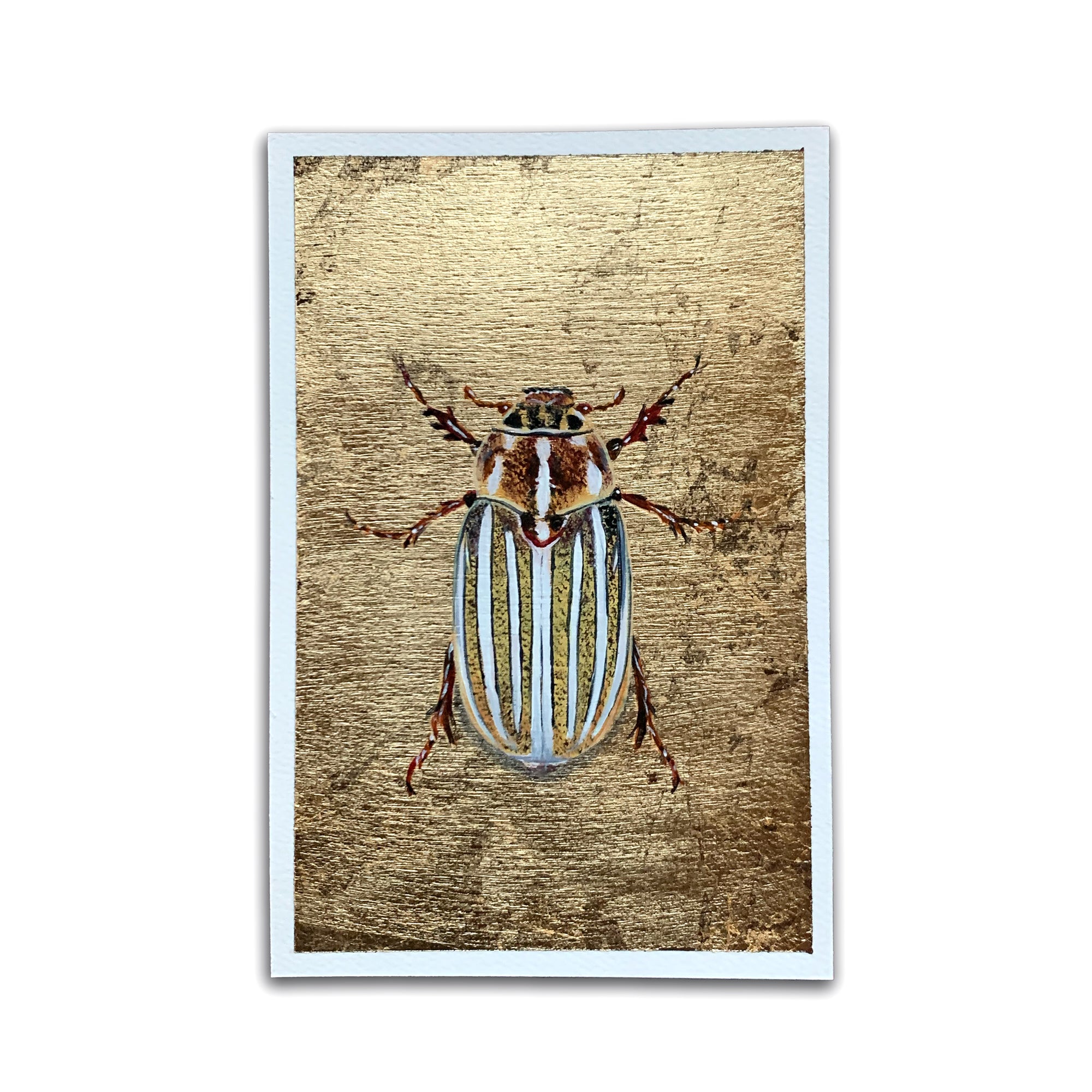 Elevate your walls with this striped beetle painting inspired by the wood element. Featuring an exquisite 10-lined june beetle against a gilded backdrop, this jewel-like painting invites you to contemplate the mysteries of wood and transformation.